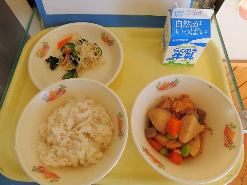 今日は、キャロッピーデーで菊陽産のさつまいもを使っています。菊陽町では、南小校区などで美味しいさつまいもが栽培されています。秋の味覚と知られるさつまいもですが、近年では、「準完全食品」として研究されるほど、栄養価の高い野菜としても知られるようになりました。さつまいものビタミンCは熱に強く、加熱してもこわれない特性をもっています。食物繊維も水溶性の食物繊維と不溶性の食物繊維をバランスよく含み、便秘の改善や予防に効果があります。さつまいもは、皮ごと食べることで、皮に含まれるポリフェノールやビタミンCなど、さつまいもの栄養をあますことなくとることができるので、給食のさつまいもは、ほとんど皮をむかずに調理しています。菊陽町で収穫されたおいしいさつまいもを、皮ごと全部いただきましょう!