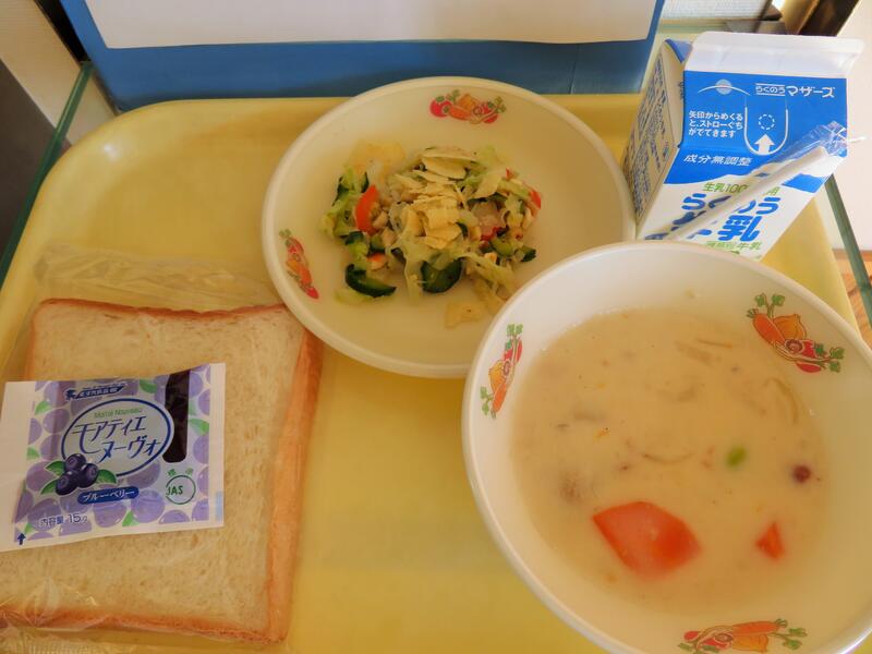 今日のメニュー 食パン、ブルーベリージャム、肉団子と豆のシチュー、カシュチップサラダ、牛乳
