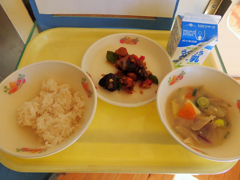 いつもは、米と麦の麦ごはんですが、今日はもちきびを加えた三穀ごはんです。もちきびはイネ科の雑穀で、穀物の中で一番低カロリーといわれ、良質なたんぱく質、ミネラルを含む優れた食材で、特に鉄分、亜鉛、マグネシウムが多く含まれています。甘みがあって粘りが強いので、いつもの麦ごはんにもちきびを加えることで、ヘルシーでおいしくなります。寒くなり、さといもを使うメニューが多くなりました。さといもは、皮をむいたものを買うこともできるのですが、コストとおいしさにこだわって、北小では給食室で皮むきからしています。今日のさといもサラダも、15キロのさといもを皮むきして作りました。さといもは苦手という人にも、さといものおいしさが少しでもわかってもらえると嬉しいです。もりもり食べて今週もがんばりましょう!