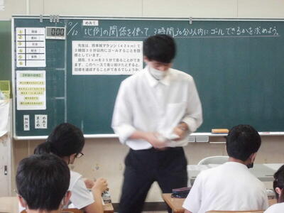 7月12日(水)の5時間目、今年第1回目の研究授業を行いました。今年も本校では算数の研究に取り組みます。今回は、6年生で、「比例と反比例」を扱った授業を実施しました。外部から講師をお招きし、専門的な助言をいただいたところです。研究の柱は何点かあるのですが、対話的な学びをどう進めるかもその一つ。本時の問題は、「先生は、熊本城マラソンで3時間30分以内にゴールすることを目標としています。現在、5kmを25分のペースで走ることができます。このペースで走った場合、目標を達成することができるでしょうか。」というもの。担任で授業者の山田先生のリアルな課題をそのまま問題に落とし込みました。私たちは、日常の生活の中で、比例の考え方を使うことが多々あります。この問題もその一つの例ですね。子供たちは、ペアや全体で、対話によって自分の考えを整理し、表現していきました。また、表や式などを用いながら、何とか自分の考えを伝えようとしていました。講師の先生からは、「しっかり話ができる子供たちですね」というお話がありました。6年生は現在いろいろなことに頑張っています。今日もその姿を見せてくれました。