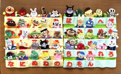 クラス全員の手形を集めて作った「て」の字。針金と綿で作った「ゆ」の字。アルミホイールをねじってかたどった「ね」の字、井野教諭が『子どもたちが楽しみながら覚えられるように』との思いで作った「アンパンマン指人形ひらがな表」など、「これでもかの愛情」に包まれています。本校の教室では、子どもたちの「瞳が輝く」授業づくりが日々展開されています。