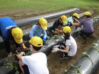 29日(月)から、順次、サツマイモの苗植えを「きょうだい学年」で行っています。「きょうだい学年」とは、1・6年、2・5年、3・4年の組合せのことです。特に、4・5・6年の子供たちは、下の学年の子供たちに、苗の植え方を丁寧に教えるという役割が待っています。「1対1」「班」など、話がしやすいような形態で行います。最後には意見交流を行うなど、ただ苗植えをするだけではなく、コミュニケーションを図る力(上級生にとっては、わかりやすい表現で説明する力も必要ですね)を付けるため、有意義な時間となっています。3・4年生の様子を覗いたところ、慣れた手つきで植えている子供ばかり。「(苗は)寝かせてね。」「(穴の深さは)これくらい?」などと、コミュニケーションを取りながら植えている様子が見られました。