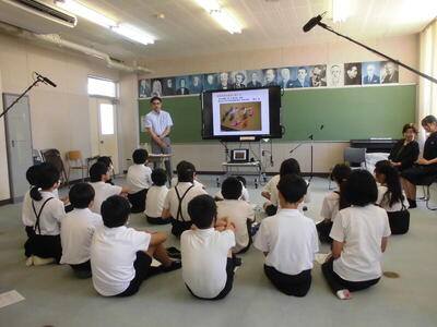 7月11日(火)は、毎年行っている「平和学習」の日でした。今回講師として、工藤武子さん(熊本県被爆者団体協議会理事)、青木栄さん(熊本被爆二世・三世の会会長)、嶌村理彩さん(第26代高校生平和大使)の3人の方々に講師として来ていただくことができました。熊本日日新聞の7月4日朝刊に、工藤さんたちの活動が大きく紹介されていたので、御存知の方もいらっしゃるかもしれません。工藤さんには、すべての学年を対象に、紙芝居「長崎原爆被害のおはなし~いま、私が伝えたいこと~」を、嶌村さんには、平和大使としての活動についてお話ししていただきました。また、青木さんには、6年生に対して、「被爆2世として生きる」と題して講話をしていただきました。子供たちは、たくさん集まったテレビ局や新聞社の方々に圧倒されている様子もありましたが、本当にいろいろなことを学びました。(ここでは到底書き尽くせませんので、ぜひ子供さんにお話を聞かれてください)青木さんの、「戦争を“他人事”ではなく“自分事”として考えてほしい」という言葉がとても強く心に残りました。
