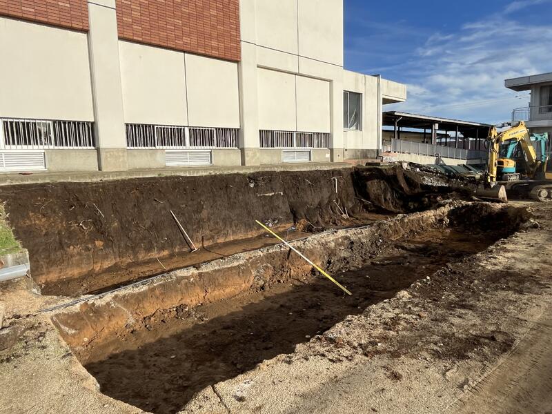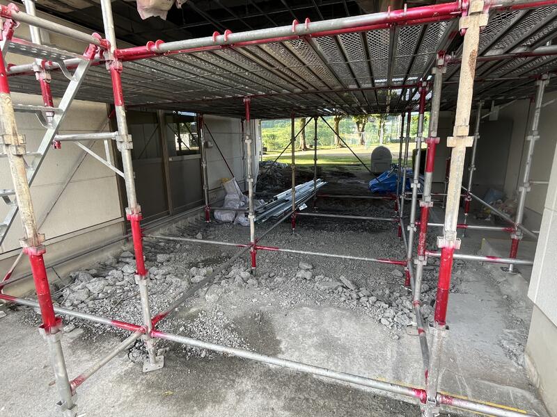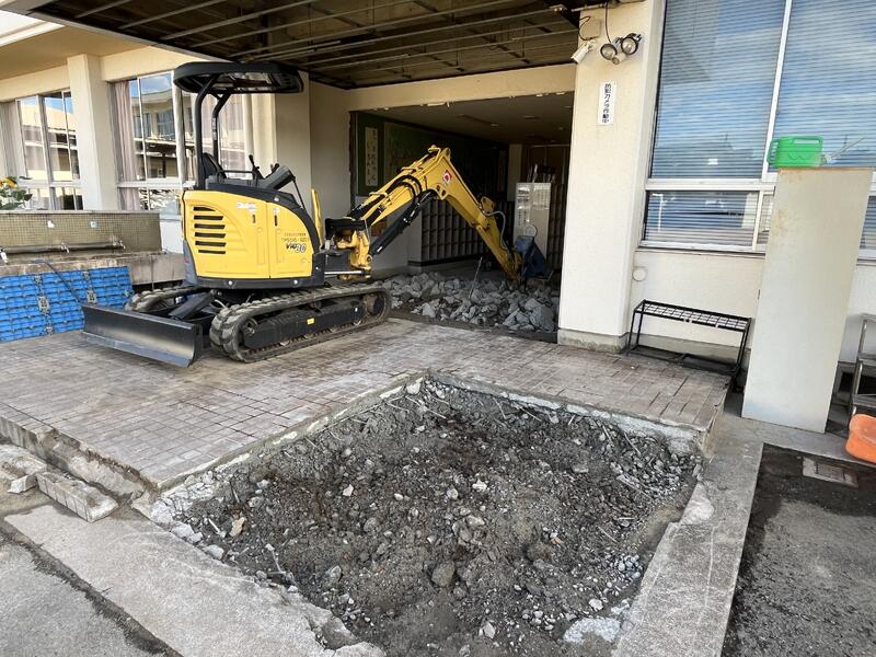 現在、本棟玄関、本棟と新棟の間、本棟児童昇降口、体育館入口スロープ設置、給食棟横の倉庫解体(エレベーターが設置できるように)と、工事が急ピッチで進められています。