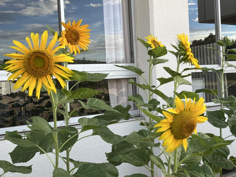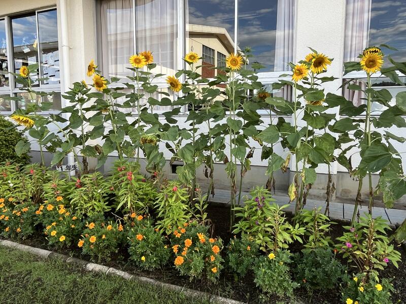 1年生の学級花壇を見ると、ひまわりをはじめとする花々が、美しく、元気に咲いています。