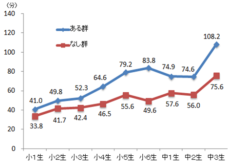 このグラフを見ると、親子で将来や進路について話をするほうが、子どもの学習時間は長いという明らかな結果が出ています。親と将来や進路について話をしている子どものほうが、勉強時間が長いのはどの学年も共通しています。特に小4以降はその差が歴然として、小4~小5では20分前後、小6では30分以上の差になっています。中学生でも同様に、中1~中2は20分弱、中3では30分以上の差と、受験の前にさらに差がつく傾向が見てとれます。
