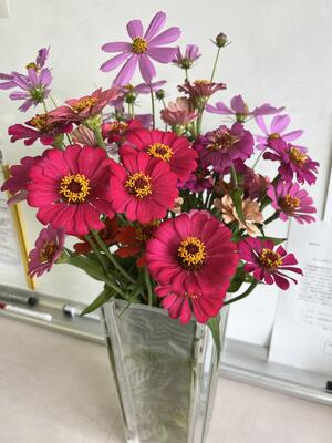 生花がもたらす心理的効果を調べたところ、花のない部屋に比べて花のある部屋では「活気」「リラックス」が大幅に増加し、「混乱」・「疲労」・「緊張・不安」・「抑うつ」・「怒り・敵意」が低下することが明らかになっているそうです。子どもたちは、学校というストレスが強い社会に行くわけですから、花は必要な心の栄養と言えるでしょう。