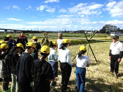 10月21日(月)に、5年生が稲刈りを行いました。これは、西岡和明様のご厚意により成り立っている、田植えから稲刈りまでをとおした体験活動です。