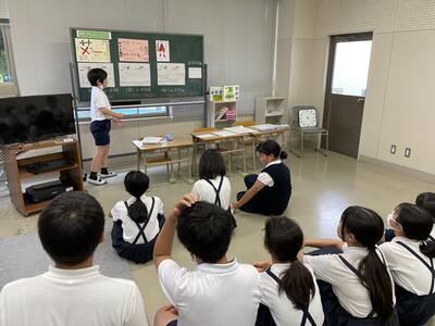 毎年恒例の「子どもガイド養成講座」の開講式を実施しました。今年も、「菊陽町文化財ボランティアガイドの会」の松永様、矢野様、上村様、有働様に講師としておいでいただきます。また、開講式には岡本生涯学習課長もおみえになり、3・4年の子どもたちへ、ガイドの証である帽子を贈呈してくださいました。開講式のあと、基礎講座①「加藤清正公の水物語」を学習しました。3年生にとっては初めての本講座。秋には、ガイド活動や本講座をベースにした音楽劇を披露することになります。このような形でふるさとについて学習できることは、本当に幸運なことです。これからの子どもたちの学習の様子がとても楽しみです。
