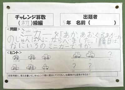 そこで決まった内容は、一つ目は、「チャレンジ算数問題」を初級・中級・上級の三種を作って掲示し、たくさんの人に問題を解いてもらって、楽しさを知ってもらうこと。二つ目は、自分の強み(得意なこと)を活かして活動することです。本が好きな人は本で調べたり、タブレットが得意な人はインターネットで調べたりしながら問題を作ります。イラストが得意な人は、ポスターやキャラクターを描いたりして、「チャレンジ算数問題」のことをたくさんの人に知ってもらいます。