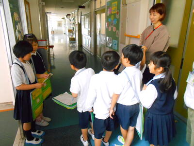 2年生は、事前に自分たちで調べた情報をもとに、わかりやすく、丁寧に教えていました。すっかり立派なお姉さんたちです。1年生は、目をキラキラさせて、1年生にとっては広い校舎の中を興味深く探検していました。