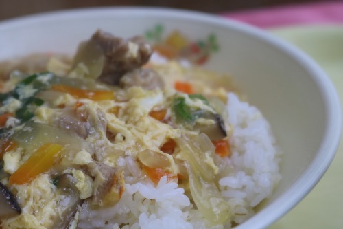 ふっくら柔らかな溶き卵の中に浮かぶタマネギ、ニンジン。