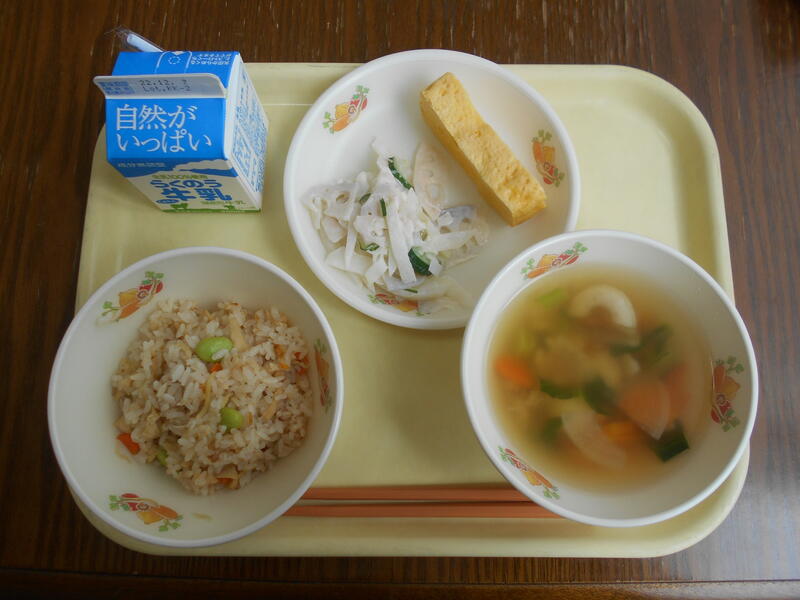 21日(月)は、11月の「ふるさとくまさんデー」は宇城地区の特産物を使った献立でした。献立は、「しょうがご飯、白玉汁、卵焼き、れんこんサラダ」。宇城地区は、温暖な気候を生かし、れんこんやトマト、みかんなどの栽培が盛んです。また、熊本県のしょうが生産量は全国2位なのを御存知ですか?そのうちの約8割が、宇城市小川町と八代市東陽町で作られています。また、小川町は白玉餅の原料である餅米の産地で、白玉粉を作るのに必要な清らかな地下水が豊富に湧き出しています。このようなことから、白玉粉作りが盛んになりました。また、松橋町にはレンコン畑がたくさんあります。現在、県内一の産地となり、全国に出荷されています。れんこんは、「先の見通しがきく」ということで、縁起のよい野菜としておせち料理などの祝い事に使われているのは御存知のとおりですね。しょうがご飯などは、なかなか家では作らないものですが、風味がよく、とても美味しかったです。ごちそうさまでした。