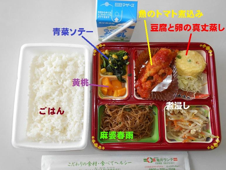 魚は、カレイの切り身に片栗粉をまぶし、油で揚げたものをトマトの水煮と一緒に煮込んでありました。子どもたちからも好評でした。麻婆春雨もとても好評で、どの学年の児童も残さず食べていました。豆腐と卵の真丈蒸しは、だし巻きのようなおいしさとふわっとした玉子焼きの2つをいいとこ取りしたおいしさでした。煮浸しは、かくれ人気メニューでシャキッとしたもやしの食感とうすい醤油味がうけていました。青菜ソテーは、素材の味がでていました。おかずに色取りを与えていました。黄桃は、「マンゴー?」と思えるくらいの甘さでいいデザートになっていました。