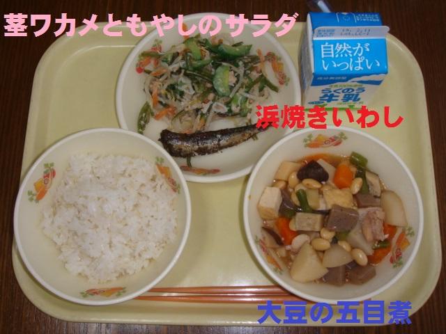 今日の給食は、大豆の五目煮、茎ワカメともやしのサラダ、ごはん、牛乳でした。
