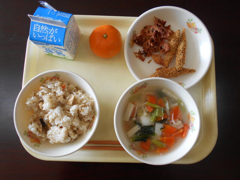 今月の「ふるさとくまさんデー」は宇城地区の食材を使ったものでした。メニューは「びりんめし、白玉汁、きびなごフライとれんこんチップ、みかん」です。宇城在住の私にとっては(山田先生もですが)なじみの食材ばかりです。小川町は白玉粉の生産で有名です。今回は白玉汁にしていただきました。松橋町はレンコンの生産が盛んで、今では熊本県内一の産地です。「先の見通しがきく」として縁起の良い食べ物ですね。昔勤めていた松橋の学校で、生徒がよくレンコンを使って調理実習をしていたのを思い出します。また、宇土半島南岸の不知火町、三角町ではみかんがたくさんとれます。私も小さい頃はいつもたくさんのみかんを食べていました。唯一、知らなかったのが「びりんめし」。三角町の戸馳(とばせ)島に伝わる郷土料理で、肉のかわりに豆腐が入った混ぜ御飯です。今日も美味しくいただきました。