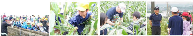 12日、トウモロコシ収穫体験を行いました。これは、中村農園の中村健二様のご厚意で実現したものです。全校児童が畑に入って、トウモロコシが実っているところを自分の目で見て、自分の手で収穫し、持ち帰らせていただきました。全国から注文が入る甘くて美味しいトウモロコシを一人4本もいただき、両手に抱えている子どもたちはとてもうれしそうでした。