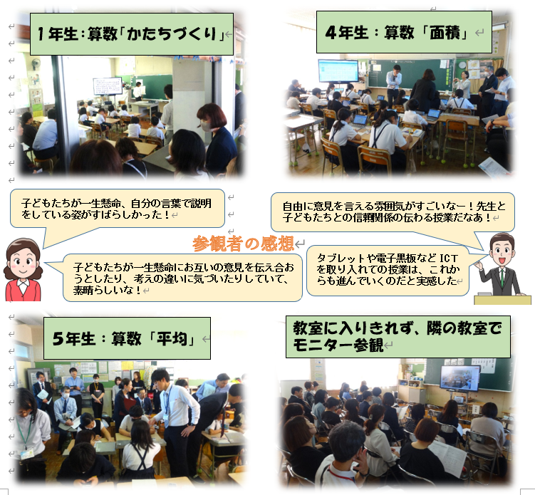 参観者からは、「子どもたちが真剣に課題(問題)と向き合い、一生懸命に考えたり、意見を交流させたりする姿に感動した」というありがたいご意見をたくさんいただきました。また、本校が「保護者や地域の方々に愛されているからこそ見られる子どもの成長の姿」と称賛いただいたご意見も大変うれしく感じたところです。