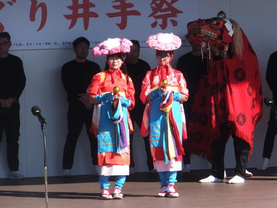 馬場楠の獅子舞は荘厳かつ華麗で、歴史の重みを感じさせてくれました。ステージの正面で鑑賞していた子どもたちは、獅子舞に噛まれ福をもらおうと楽しんでいました。