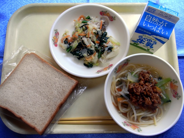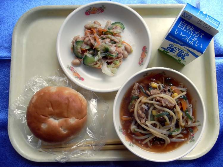 本校の給食にでるラーメンの麺は、スパゲティである。通常の中華麺では、いわゆる「のびて」しまうためだ。ラーメンとはいえ、具たっぷりでおかずとしても申し分ない。うまかあ!