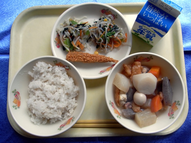 やわらかい大根、里芋、あつあつの厚揚げ、ちくわなど、しっかりと味もしみこみ、美味しかった。給食にはもってこいのおかずになっている。