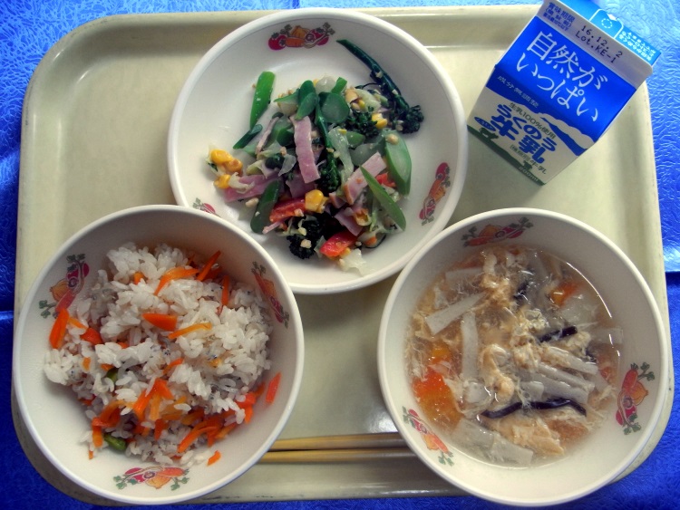 ☆にんじゃこご飯 かき玉汁 スティックセニョールのサラダ 牛乳