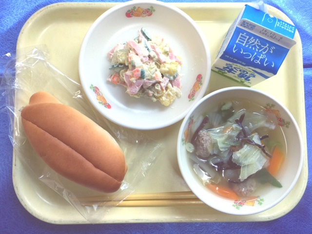 ☆スイートポテトサラダ 肉団子スープ コッペカットパン 牛乳