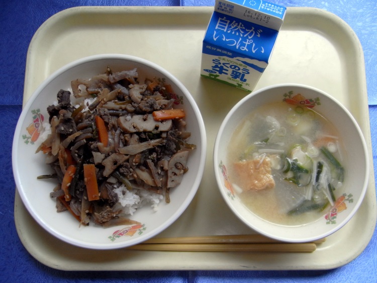 ☆れんこんきんぴら丼 里芋の味噌汁 牛乳