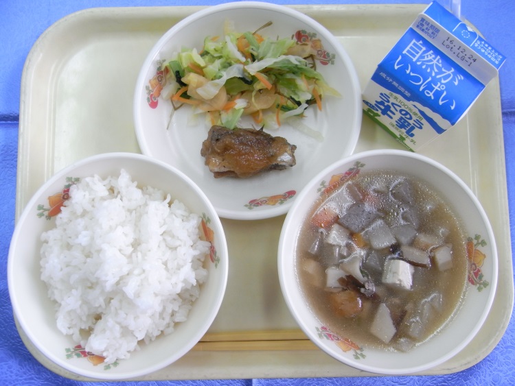 ☆のっぺい汁 即席漬け 秋刀魚のみぞれ煮 ご飯 牛乳