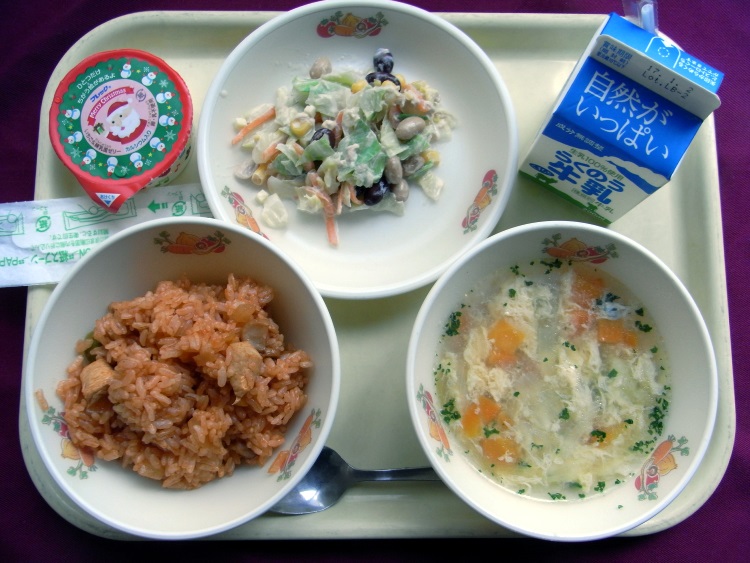 2学期最後の給食。しっかりと味を主張しているチキンライス。卵スープはほっとする。