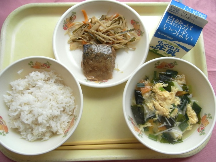 ☆ニラ玉汁 鯖のごまみそ煮 ゴボウの炒め ごはん 牛乳