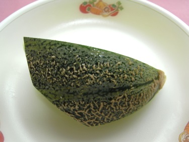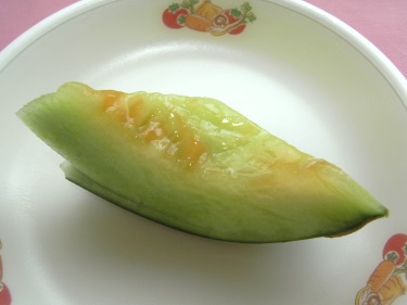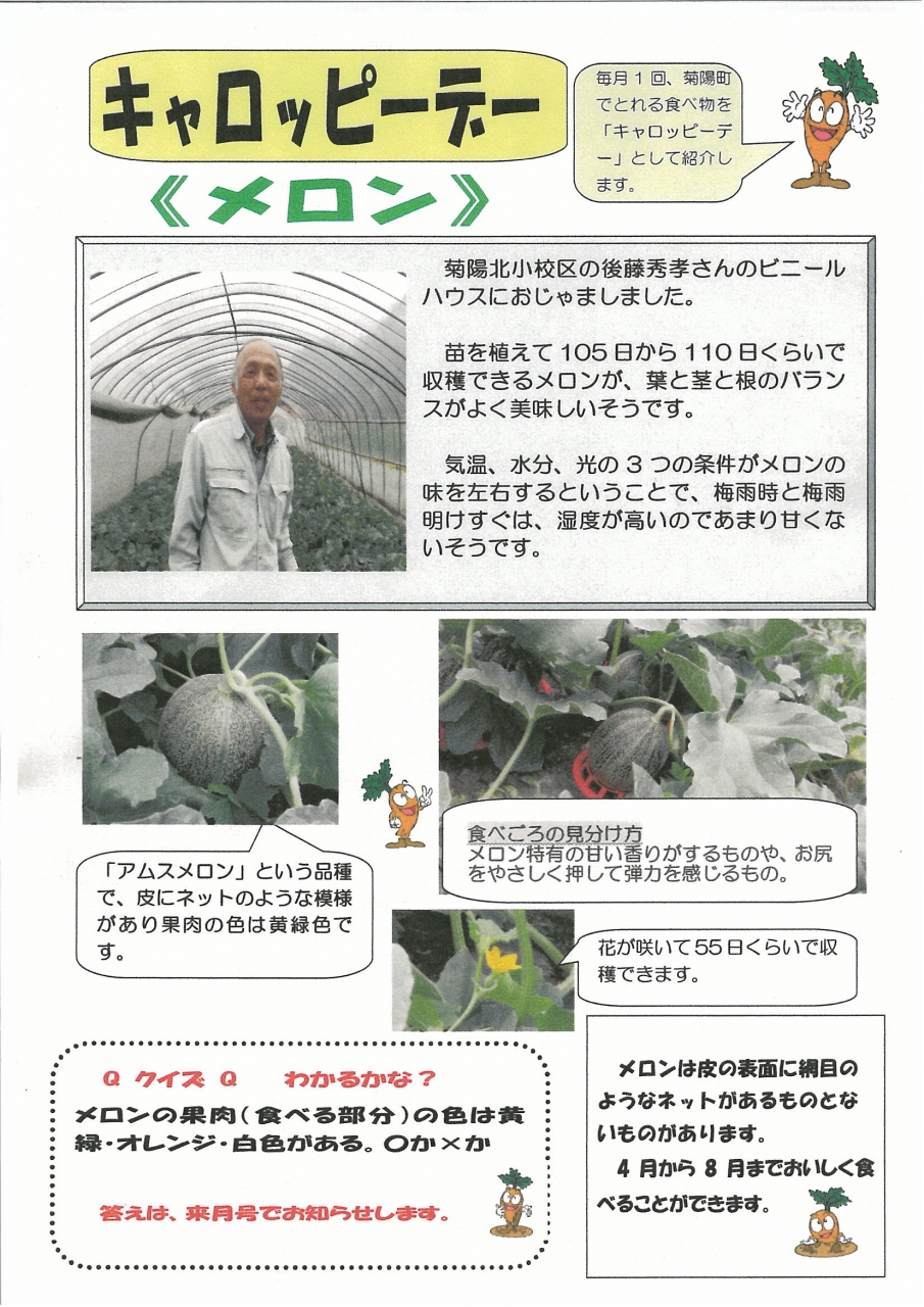 今日は、菊陽北小校区で収穫されたメロン、「アムスメロン」である。オランダからのメロンと以前からあったメロンを交配し、品種改良を重ねてできたそうだ。
