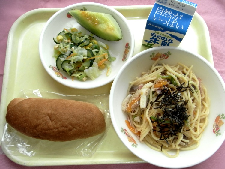 ☆たらこスパゲティ コーンサラダ メロン 玄米パン 牛乳