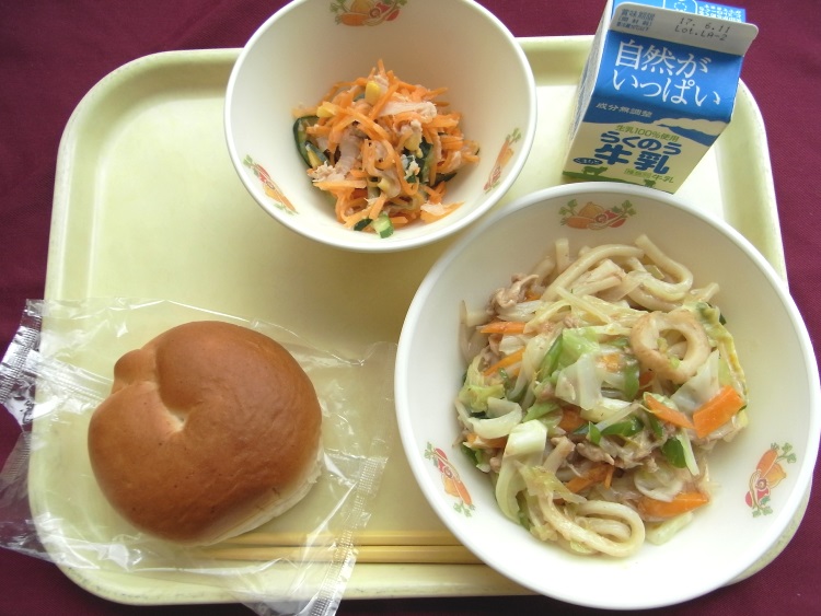 ☆焼きうどん 人参サラダ チーズパン 牛乳