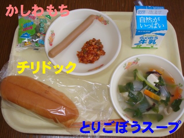 今日の給食は、チリドック、とりごぼうスープ、かしわ餅、パン、牛乳でした。