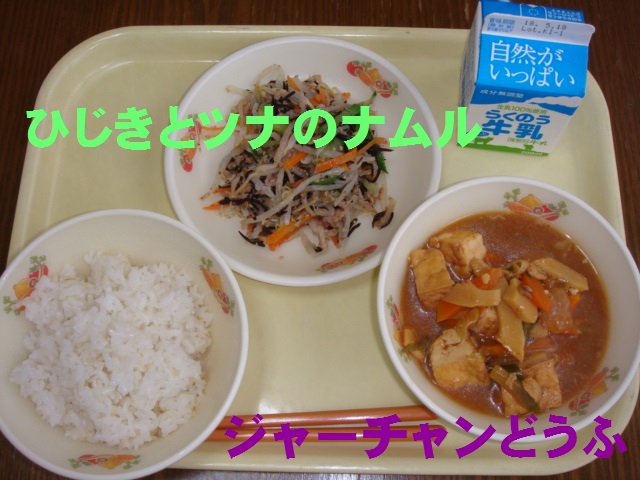今日の給食は、ジャーチャンどうふ、ひじきとツナのナムル、ごはん、牛乳でした。