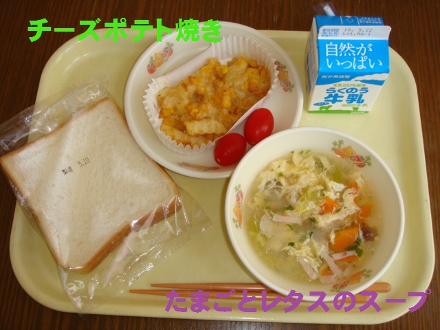 さて、今日の給食は、たまごとレタスのスープ、チーズポテト焼き、ミニトマト、食パン、牛乳でした。一目で見て惹かれたのが、カップ入っていたチーズポテト焼きです。下ごしらえをした後で、チーズをのせオーブンで焼いてありました。絶妙にこげ目がはいり、香ばしいかおりが広がっていました(100食分大変だったろうなあ・・)。パンにのせるとピザのようになりました。パンと一緒にほおばるとチーズの風味にツナの風味、コーンの甘さが口一杯に広がりあっという間に完食。スープは、レタスに、セロリ、にんじん、パセリと1つ1つで考えると苦手な子どももいるはずですが、一緒になるとたまごの風味を引き立て美味しくなります。さらに、最後に残ったミニトマトは、採れたて新鮮!!、かじると甘いこと甘いことびっくりしました。今日も給食に感謝していただきました。