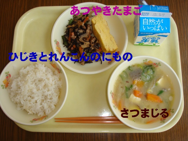 本日の給食は、さつまじる、ひじきとれんこんの煮物、厚焼きたまご、ごはん、牛乳でした。