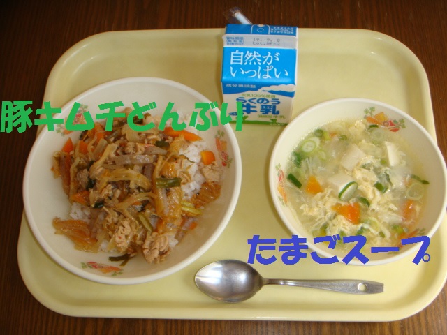 今日のメニューは、キムチ豚どんぶりとたまごスープでした。この2つが食欲を旺盛にさせてくれました。キムチ豚どんぶりは、ちょっとスパイシーでニンニクの風味もきいていて、どんどん食が進みました。野菜もキムチ(白菜)のほか、人参、ニラ、もやしも入っていて疲れた体にもうれしいメニューでした。たまごスープには、いつもよりネギがたくさん入れられていました。
