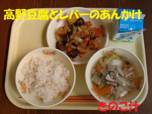 今日のメニューは、きのこ汁、高野豆腐とレバーのあんかけ、ごはん、牛乳でした。