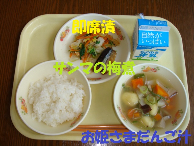 今日の給食は、お姫さまだんご汁、鰯の梅煮、即席漬、ごはん、牛乳でした。
