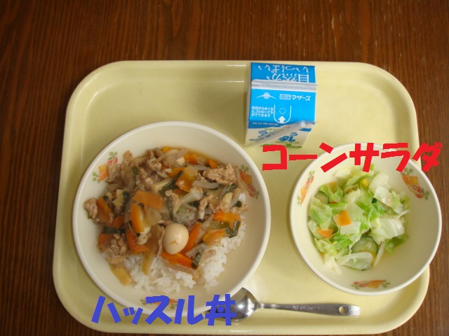 今日の給食は、ハッスル丼、コーンサラダ、牛乳でした。