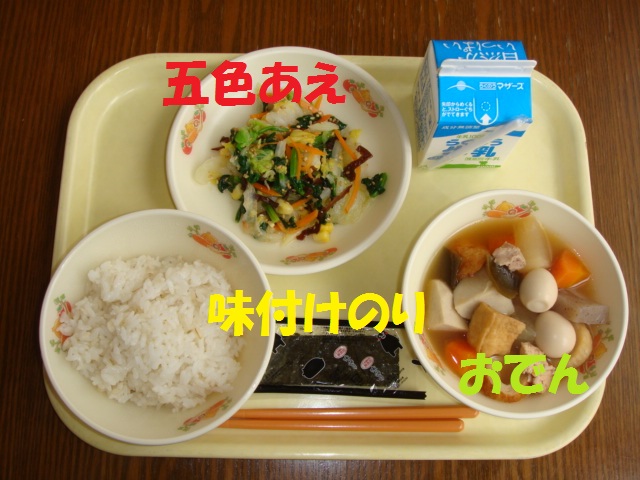今日の給食は、おでん、五色あえ、味つけのり、ごはん、牛乳でした。