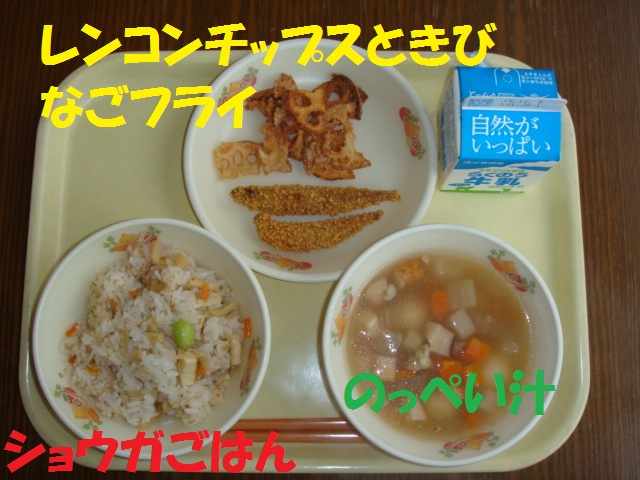 今日の給食は、ふるさとくまサンデーで宇城地区の味をテーマに作ってありました。メニューは、ショウガごはん、のっぺい汁、レンコンチップスときびなごのフライでした。ショウガごはんは、宇城の特産のショウガを使った炊き込みごはんでした。ショウガは今が旬ということですが、調理で一段とうまみを感じさせてくれました。調理は、ショウガをこれ以上ないと言うくらい細く刻んであり、ごはんにショウガの優しい風味が広がっていました。絶品でした。
