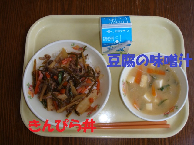 今日の給食は、きんぴら丼、豆腐の味噌汁、牛乳でした。