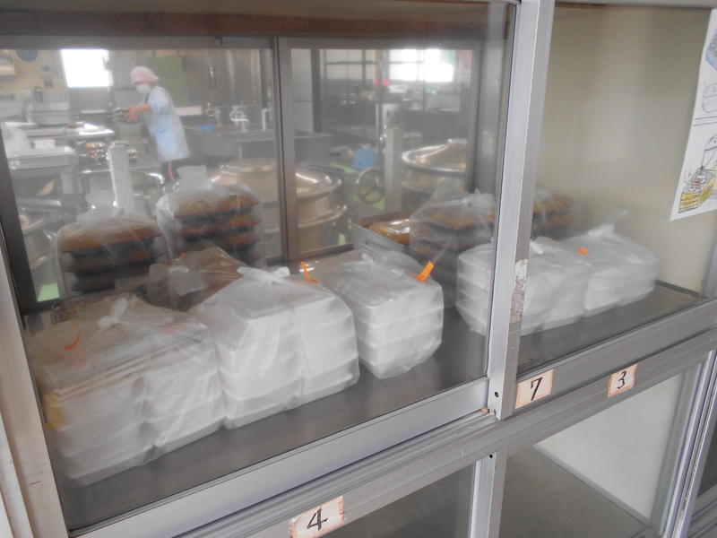 どんなものが届くのだろう・・。と少し不安でしたが、11時に業者さんから学校に届けられました。保温と保管のため専用のケースにごはんとおかずが別々に入れられており、そのまま給食室に搬入されました。この後、クラスごとに調理員の先生に数をそろえていただき、子どもたちが取りに来るのを待ちました。