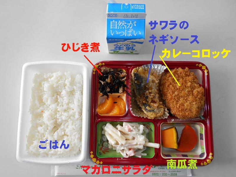 さて、今日のメニューは、サワラのネギソース、カレーコロッケ、マカロニサラダ、ひじき煮、南瓜煮、ひじき煮、みかん、ごはん、牛乳でした。サワラのネギソースは、サワラを一度油で揚げ、炒めたネギを酢・醤油などで味つけしたソースがたっぷりかかっていました。ちょうどよい酸味でおいしくいただきました。カレーコロッケは、子どもたちにうれしいカレー味でした。添付されたウスターソースと添えられた千切りキャベツが相性がよく、ごはんが進みました。ひじき煮は、あげが上手に使われていて食感がよかったです。南瓜煮は、彩りよく形も崩さないように上品に作られていました。マカロニサラダは、マカロニの食感よくこどもたちもおいしく食べていました。デリバリー給食は、明日までです。