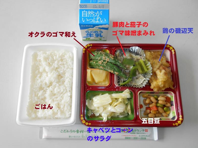 メニューは、鶏の磯辺天、豚肉と茄子のゴマ味噌まみれ、五目豆、オクラのゴマ和え、キャベツとコーンのサラダ、スパゲティー、パイン、ごはん、牛乳でした。