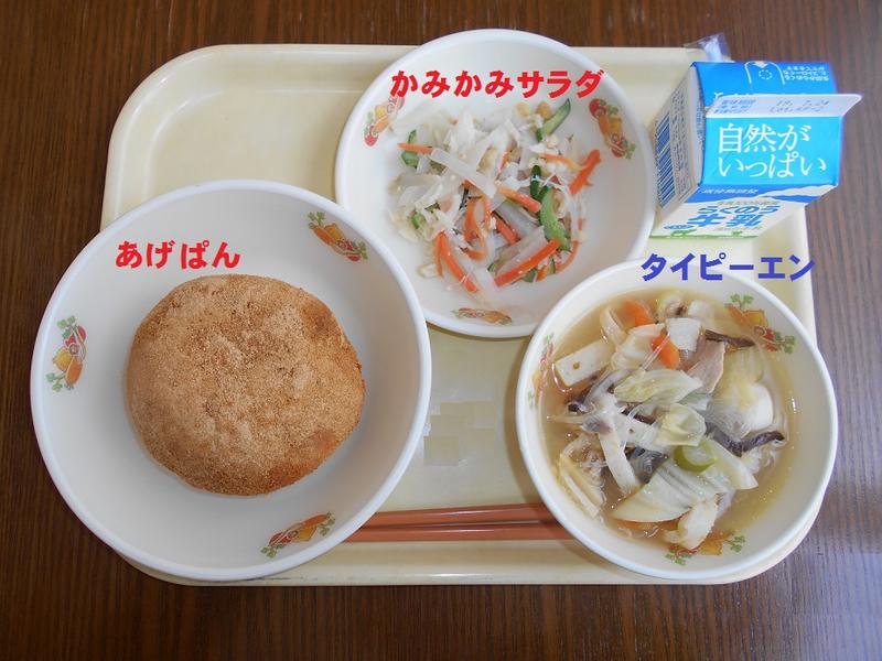 タイピーエンは、鶏ガラのスープに、豚肉、エビや具材のダシがしっかり出ていて、やさしい味に仕上げられていました。春雨のツルンとした食感もとてもよかったです。カミカミサラダは、シャキッとした大根、ゴボウ、キュウリにさきイカがあえられていて、とてもよい食感でした。噛んでいると、さきイカのおいしさや、チーズの風味、カシューナッツの味がどんどん出てきました。ドレッシングも自前の調合でとってもおいしかったです。最後はあげぱん、これは口のまわりにたくさんきなこがついても、きなこの風味とほのかな砂糖の甘さが抜群でみんな黙々と食べていました。給食はおいしいです!!。