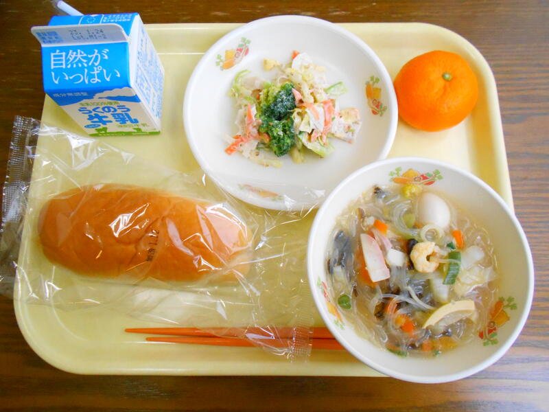 知のとおり、「水と緑の都」と呼ばれる熊本市。なす、れんこん、大豆、すいか、みかんなど、いろいろな農産物が栽培されています。今回いただいたのは、「タイピーエン、ひごまるサラダ、みかん」です。御存知の方も多いと思いますが、タイピーエンは元々中国福建省の郷土料理で、おめでたい席で食べられていたスープだそうです。日本には120年ほど前に、長崎に渡ってきた人々により伝えられたと考えられています。日本の食材を使ってアレンジされたタイピーエンは、やがて熊本にも伝わり中華料理店で出されるようになりました。また、ひごまるサラダは熊本市で栽培されている野菜をつかったサラダです。たくさんの種類の野菜が使ってあり、とても食べごたえがありました。河内町ではみかんの栽培が盛んですが、有明海に面した段々畑で太陽の光をたっぷり浴びて育ったみかんはとても美味しかったですよ!今月もごちそうさまでした。